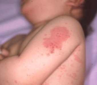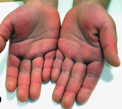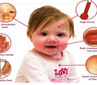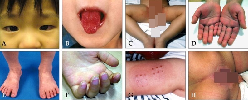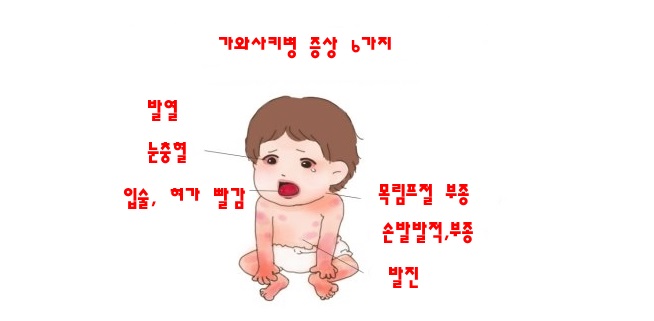 주 증상은 발열, 양쪽 눈의 충혈, 입술과 혀가 빨갛게 변합니다. 그리고 발진 특히 BCG 주사 자국 등이 빨갛게 부어오르는 것을 볼 수 있습니다. 여기에 손발도 빨갛게 부어 오르고 목의 림프절도 붓습니다.