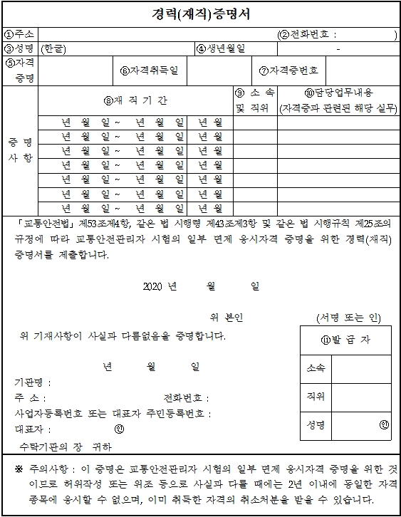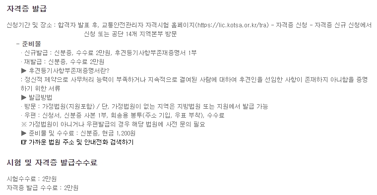 교통안전관리자 자격시험 합격한 후 자격증을 발급 받기 위해서는 신규발급은 신분증과 수수료 2만원, 후견등기사항부존재증명서1부가 필요하며 재발급의 경우는 신분증과 수수료 2만원이 필요합니다. 여기서 후견등기사항부존재증명서라는 것은 무엇인지 궁금한데요, 정신적 제약으로 사무처리 능력이 부족하거나 지속적으로 결여된 사람에 대하여 후견인을 선임한 사항이 존재하지 않는다는 사실을 증명하기 위한 서류입니다. 가정법원, 지방법원 또는 지원에서 발급이 가능합니다.