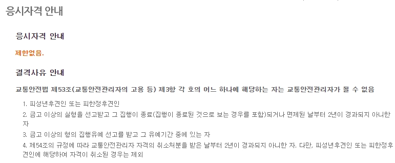 기본적으로 응시자격의 제한은 없습니다. 하지만 피성년 후견인, 피한정 후견인, 금고 이상 실형 선고받고 그 집행이 종료 또는 면제된 날로부터 2년 경과되지 않은 자, 금고 이상의 형 집행유예 선고를 받고 그 유예기간 중인 자, 교통안전관리자 자격 취소처분을 받은 날부터 2년이 경과되지 않은자 등의 결격사유는 있습니다.