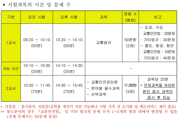1교시는 오전 9시30분부터 10시30분까지 한시간동안 필수과목인 교통법규 시험이 있습니다. 교통안전법 10~20문제, 기타법규가 30~40문제로 총 50문제이며 항목당 2점입니다.