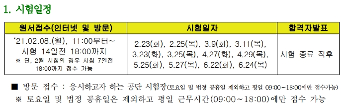2021년 2월8일 11시부터 시험 14일전 18시까지입니다. 다만 2021년 2월 시험의 경우는 시험 7일전 18시까지 접수 가능합니다.