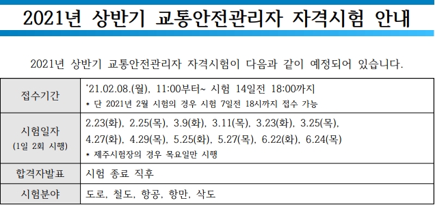 2021년 2월8일 2021년 상반기 교통안전관리자 자격시험 일정 발표되었습니다. 자세한 일정과 시험과목과 시험분야 등을 소개합니다.
