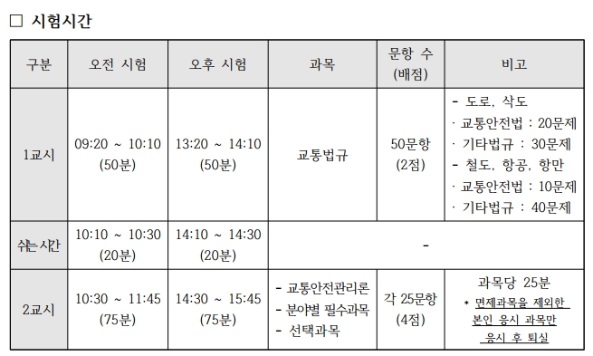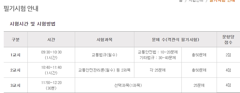2교시는 10시40분부터 11시40분까지 한시간동안 필수인 교통안전관리론 등 2과목으로 각각 25문제 총 50문항이며 문항당 4점입니다. 3교시는 11시50분부터 12시20분까지 30분간 선택과목 하나 25문제 각 4점씩으로 이루어져 있습니다.