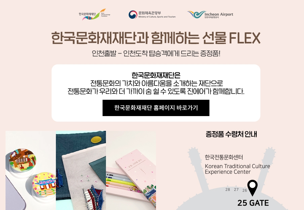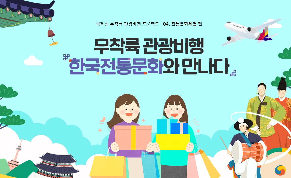 한국문화재단과 함께 한국전통문화와 만나는 관광상품이 마련되어 있습니다. 인천이나 김포에서 출발해 부산과 후쿠오카 제주를 거쳐 출발했던 곳으로 돌아오는 2시간 20분 비행상품입니다.