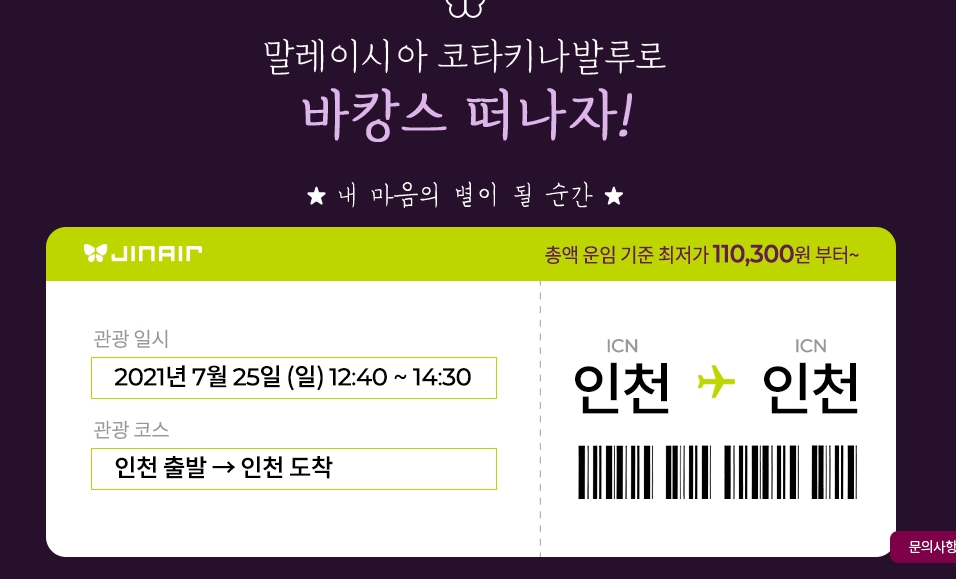 말레이시아 코타키나발루 상공을 돌아오게 되는 무착륙 관광상품으로 기내 이벤트로는 코타키나발루 현지호텔 바우처와 현지 크루즈 바우처를 추첨을 통해 제공하며 코타키나발루 왕복항공권을 3명 추첨해 제공합니다. 그리고 이 진에어 탑승객 전원에게 다이어리와 여권지갑, 볼펜 굿즈를 제공합니다.