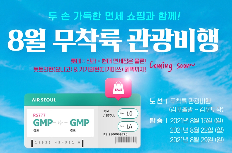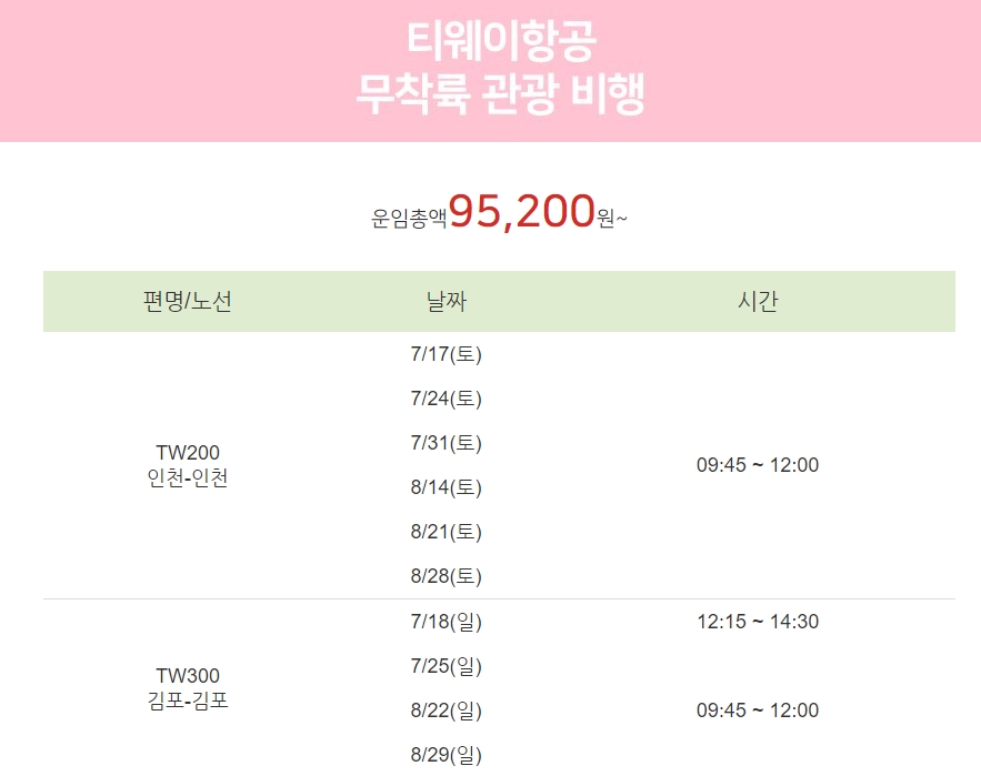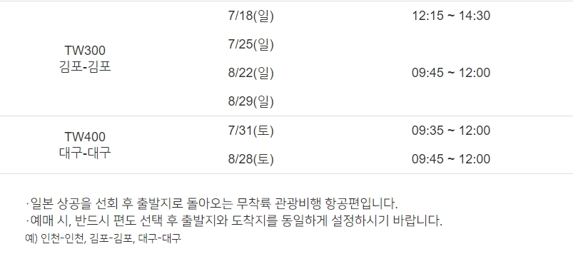 7~8월 무착륙 관광비행상품이 마련되어 있습니다. 운임 총액은 95,200원으로 인천, 김포, 대구에서 일본 상공을 선회 후 출발지로 돌아오게 되는 관광비행 항공편입니다. 인천은 7,17일, 24일, 31일, 8월14일, 21일, 28일로 9시 45분 출발 10시 도착입니다.