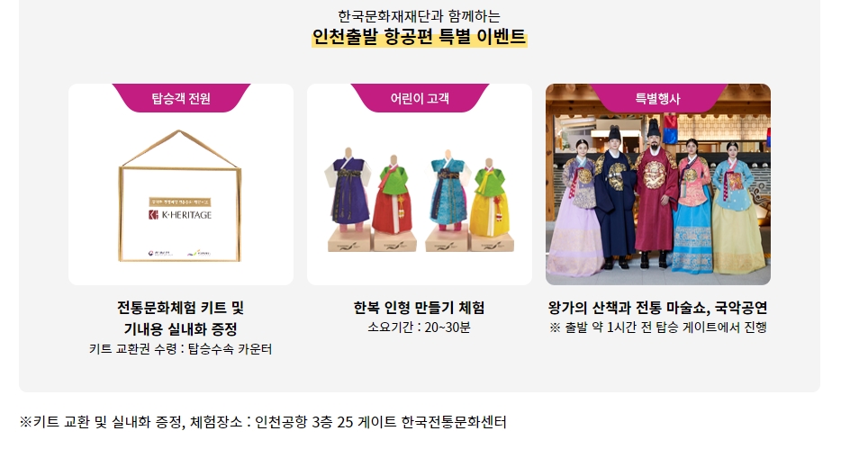 특히 이번 아시아나 무착륙 관광비행 상품은 한국문화재단과 함께하면서 전통문화체험 키트 및 기내용 실내화가 탑승객 전원에게 제공되며 어린이 고객은 약 2,30분간 한복인형만들기 체험, 출발 1시간 전 탑승게이트에서 왕가의 산책과 전통마술쇼, 국악공연이 이루어집니다.