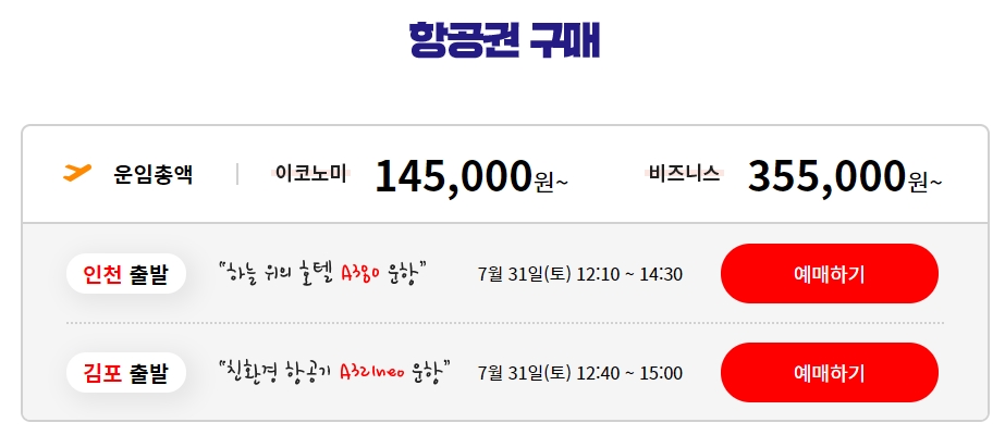 이코노미는 145,000원, 비지니스는 355,000원으로 7월31일 토요일 인천에서는 12시10분부터 14시30분까지, 김포 출발은 7월31일 12시 40분에서 15시까지 하늘위에서 비행기를 타고 기분을 낼 수 있습니다.