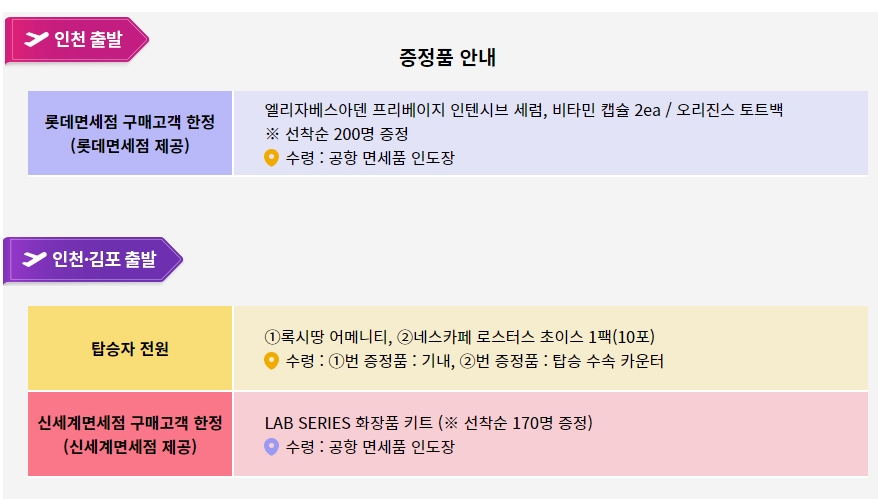 인천과 김포출발 탑승자 전원에게는 록시땅 어메니티, 네스카페 로스터스 초이스1팩이 제공되고 신세계면세점 구매고객에게는 랩시리즈 화장품키트가 증정됩니다.