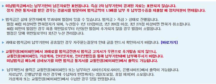 하지만 이때 과태료 부과 통지를 받고 나서 확인해 보세요. 범칙금 또는 과태료 납부 두가지가 있을 것입니다. 범칙금으로 납부할 때는 과태료보다 벌금은 적지만 벌점이 부과됩니다. 과태료는 벌점은 없지만 벌금이 좀 더 높습니다. 즉 과태료 부과대상이 범칙금 납부하고 벌점을 받을 수는 있습니다.