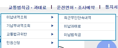 범칙금 조회 해 보려면 경찰정 교통민원24인 이파인 사이트에서 바로 확인해 볼 수 있습니다. 상단의 교통범칙금, 과태로 메뉴에 마우스를 가져가면 미납내역조회, 기납부내역조회, 교통법규위반, 민원신청 메뉴가 나타납니다. 여기서 미납내역조회에 마우스를 대면 최근 무인단속내역과 미납과태료, 미납 범칙금 확인할 수 있습니다.