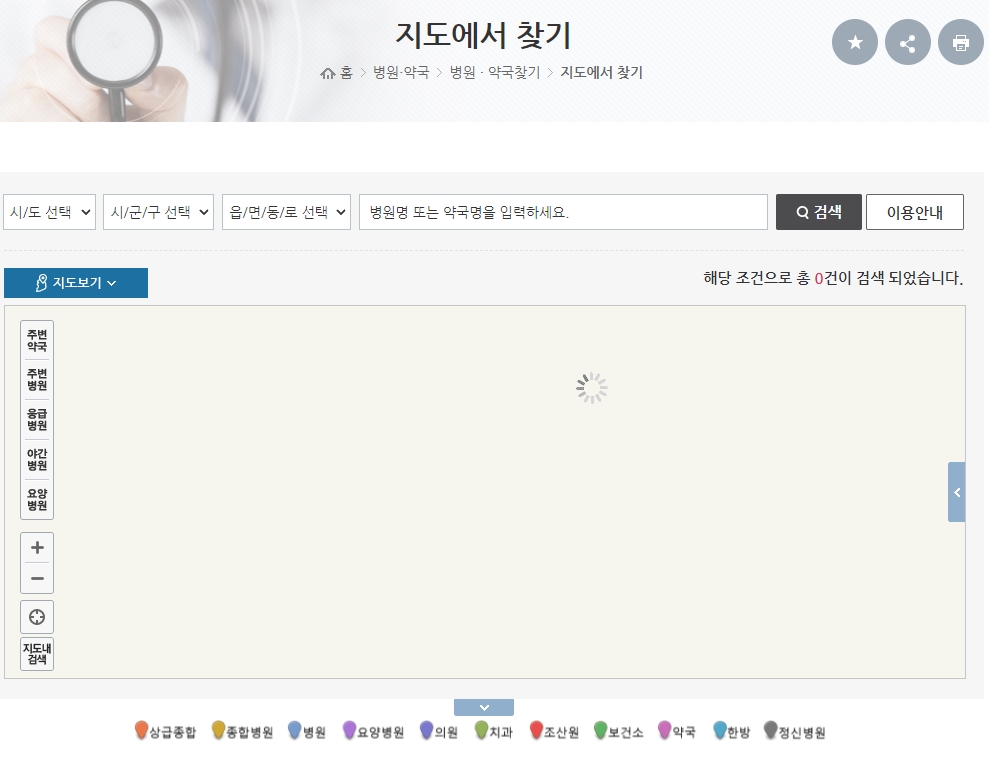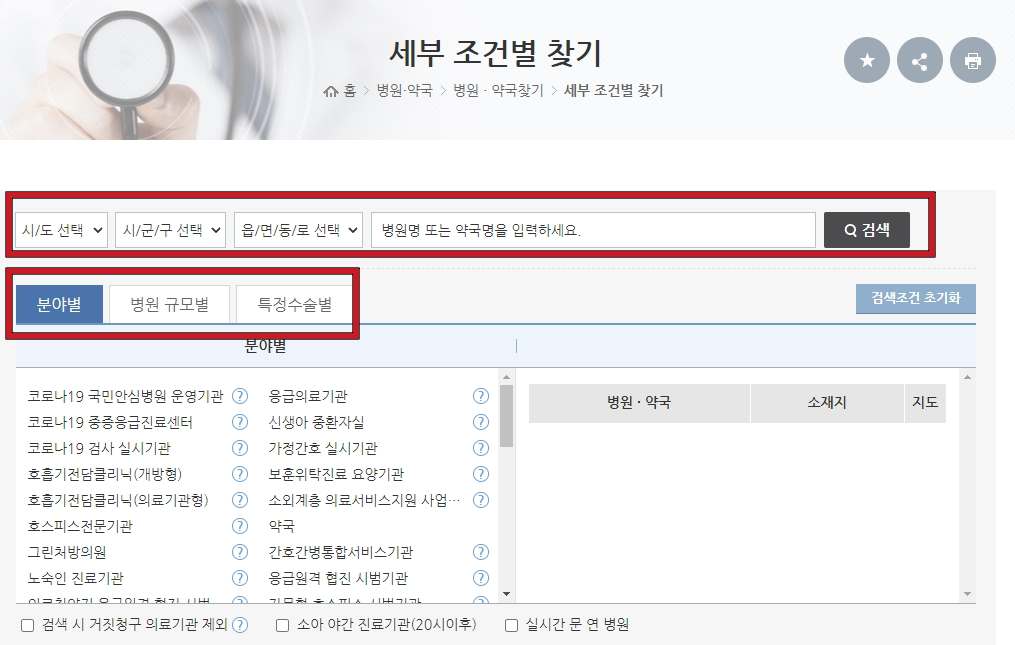 또한 우리 지역 요양병원, 응급의료기관, 재활의료기관, 난임시술의료기관 등의 전문병원을 검색할 수도 있습니다.