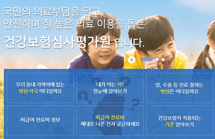 국민의 의료 부담을 덜고 안전하며 질 높은 의료 이용을 돕기 위한 건강보험심사평가원 사이트를 이용하는 것입니다. 이 심평원을 이용해서 우리 동네, 우리 지역 좋은 병원찾기 부터 내가 먹고 있는 약에 대해서도 알아볼 수 있으며 비급여 진료비, 암이나 수술을 잘하는 병원등도 찾아볼 수 있습니다.