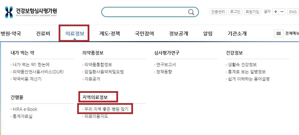 이렇게 우리 동네 병원 찾는 것 보다는 먼저 자신의 질환, 증상에 맞는 좋은 병원찾기 하고 싶다면 이때는 건강보험심사평가원 사이트에서 상단의 의료정보를 선택합니다. 의료정보 메뉴의 하위 메뉴에 우리 지역 좋은 병원 찾기가 있습니다.
