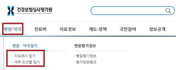 건강보험심사평가원 사이트에 접속합니다. 첫 화면의 우리 동네 가까이에 있는 병원/약국 어디일까요? 라는 메뉴를 선택합니다. 찾고자 하는 시/도/군/구/읍/면/동/로 등을 지도에서 바로 검색해서 찾아볼 수 있습니다.