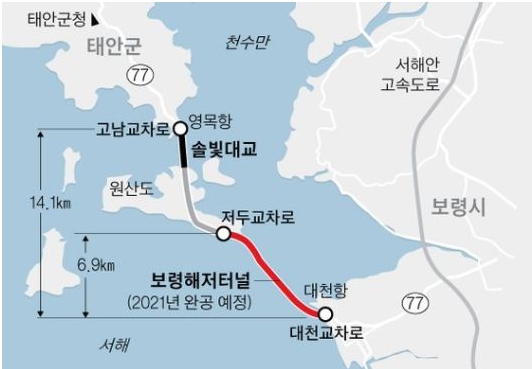 총길이기 6927m로 우리나라에서 가장 긴 해저터널이며 도로로 된 해저터널로는 세계에서 5번째로 긴 기록을 가지게 됩니다. 보령의 대천항에서 원산도를 이 해저터널로 잇고 다시 원산도에서 안면도는 1750m의 원산안면대교로 이어지게 됩니다.