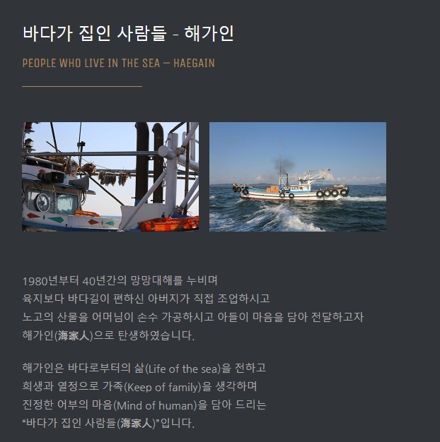 물론 그 기본이 되는 것은 역시나 멸치조업 그리고 공장과 쇼핑몰 등의 운영을 하면서 직원들을 정식으로 고용하고 판매하는 등의 여러 시스템을 제대로 갖춰나가는 일이었습니다. 그리고 그들과 함께 바다가 집인 사람들이라는 뜻의 해가인 쇼핑몰이 탄생하게 되었습니다.