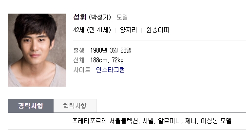 1980년 3월28일 생의 모델로 프레타포르테 서울콜렉션, 샤넬과 아르마니, 제냐 그리고 이상봉 모델이었습니다. 인물정보란에는 188cm에 72kg라고 하는데 이제 좀 달라지기도 했겠죠? 인스타그램을 보니 전혀 살이 찌지는 않은 듯 하긴 하지만요.