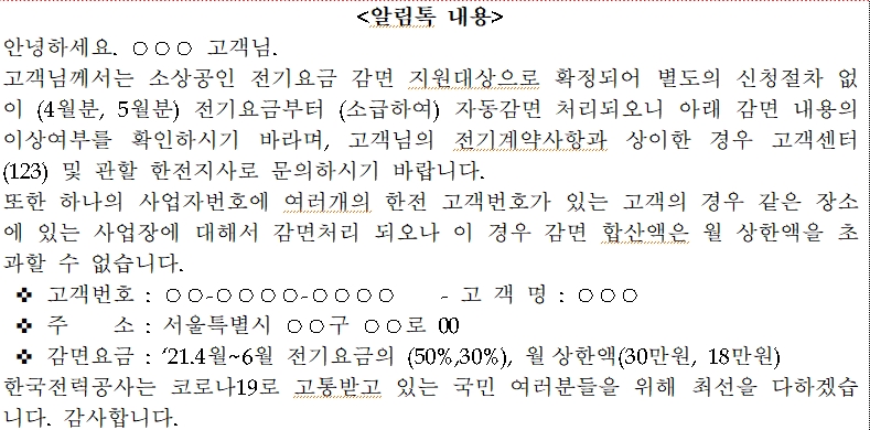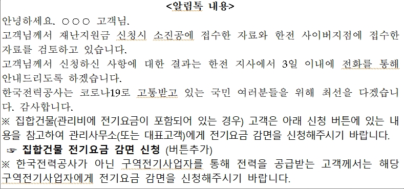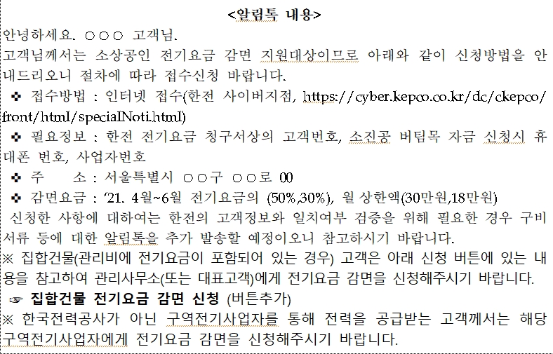 지난 제4차 재난지원금 수령 대상, 버팀목자금 플러스 사업 대상에 해당되는 소상공인과 소기업의 경우는 별도의 신청을 하지 않아도 한전에서 전기요금 감면절차를 알림톡을 통해서 안내를 받을 수 있습니다. 알림톡이 오면 그 안내에 따라서 진행하면 됩니다.