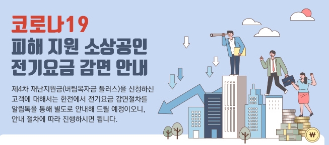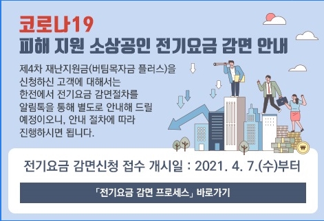 정부의 행정명령으로 집합금지 또는 영업제한으로 인해 손해를 입고 있는 소상공인과 소기업의 월 전기요금 중 30~50%를 3개월간 지원하는 내용이 골자입니다.