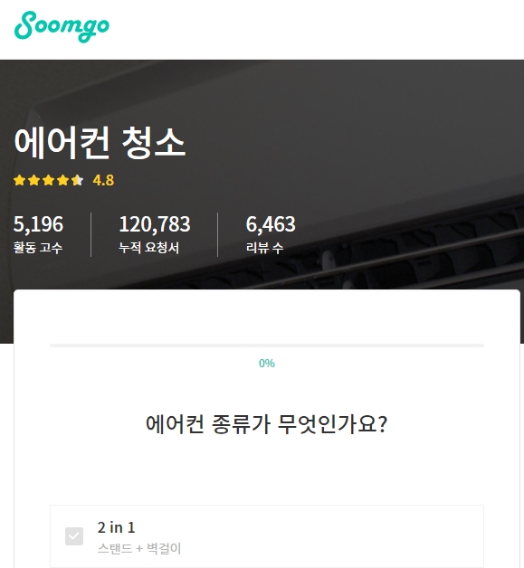 숨고에서 에어컨 청소 찾아보려니 종류와 청소할 에어컨 수량, 브랜드, 용도, 몇 평형인지를 체크하고 냉난방 겸용 제품인지 냉매가스 충전이 필요한지도 선택합니다.