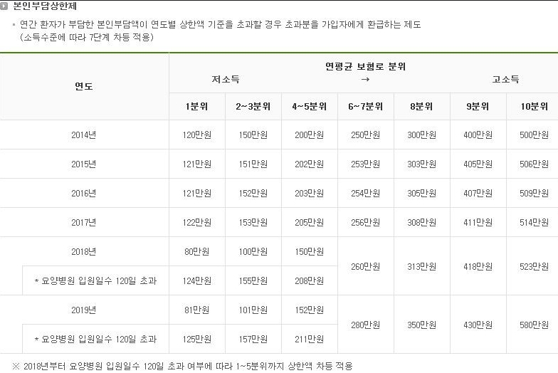 요양병원 본인부담금 상한제라는 것은 1년간의 요양병원 입원비 중에서 본인부담금 먼저 지불하고 그렇게 1년간의 보인부담금을 모두 합해서 일정한 금액을 초과하게 되면 그 다음해에 건강보험공단에서 돌려주게 됩니다. 이때는 공단에서 알려주게 됩니다. 그리고 이는 소득분위에 따라 책정금액이 다르기 ㄸ째문에 잘 확인해 보셔야 합니다. 환자 각각에 따라 다 다릅니다.