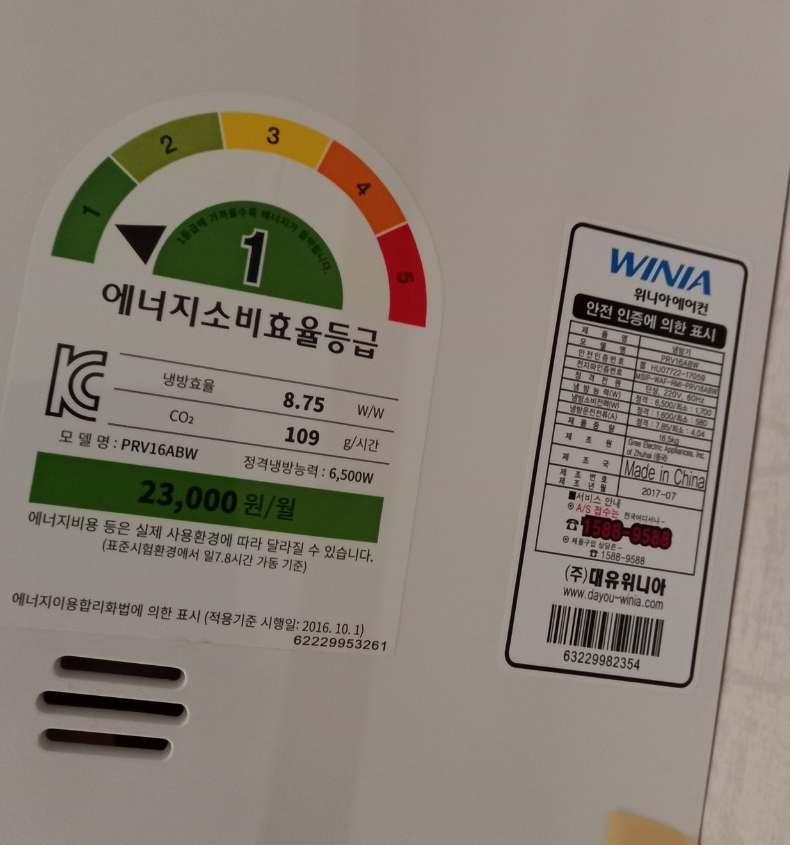 우선 2010년 이전에 구입한 에어컨이라면 볼 필요도 없이 무조건 정속형 에어컨입니다. 2010년 이후에 생산된 제품이라 해도 정속형이 있습니다. 에너지소비효율 5등급도 정속형입니다.