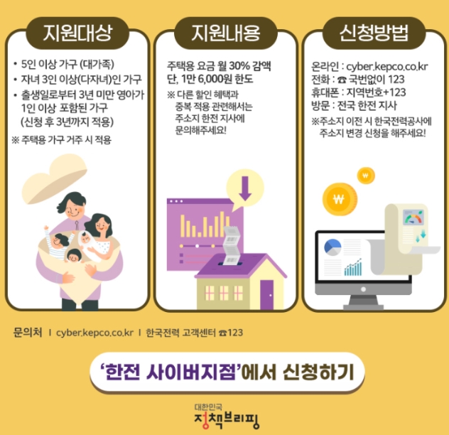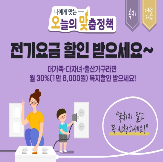 대가족, 다자녀, 출산가구 등에 전기요금 30% 할인 감면 받을 수 있다는 사실 알고 계신가요?