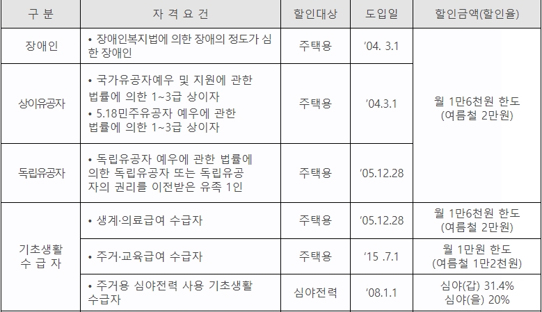 이 외에도 전기요금 감면대상에는 복지할인으로 감면신청 할 수 있습니다. 장애인, 상이유공자, 독립유공자, 기초생활수급자, 차상위계층, 사회복지시설, 3자녀 이상, 대가족, 출산가구, 생명유지장치를 사용하고 있는 가구가 해당됩니다.