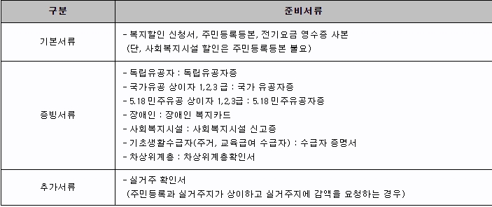또한 전기요금 감면대상 인 것을 확인할 수 있는 증빙서류 갖추어야 합니다. 각각의 대상자 기준에 따라 그 증빙서류는 다릅니다. 독립유공자와 국가유공 상이자는 독립유공자증, 장애인은 장애인 복지카드, 사회복지시설은 복지시설 신고증, 기초생활수급자는 수급자 증명서, 차상위계층의 경우는 차상위계층확인서가 필요합니다.