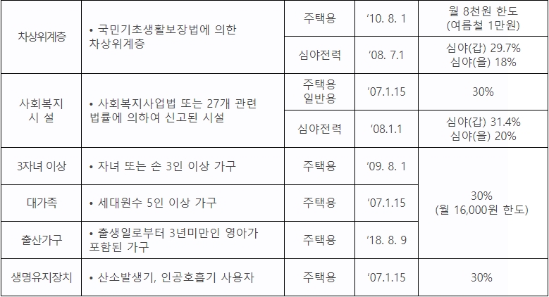 전기요금 30% 감면대상 관련해서는 3자녀 이상, 출산가구, 세대원수 5인 이상의 대가족 외에도 사회복지시설과 생명유지장치 설치한 가구도 해당됩니다.