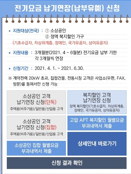 덧붙여서 전기요금 납부유예라고 해서 납기연장 신청할 수도 있습니다. 소상공인과 정액 복지할인가구 즉 전기요금 감면대상 되는 사람 들 중 납기연장을 신청할 수도 있습니다.