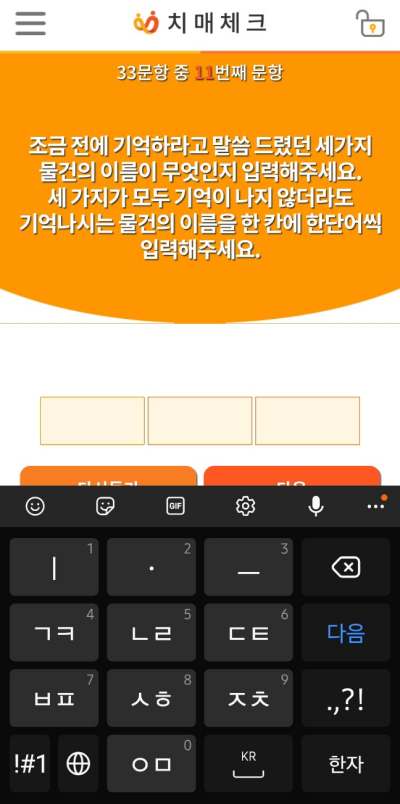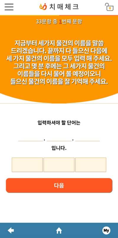 치매 검사 테스트 앱 첫번째 질문은 일반적으로 TV에서도 많이 접해봤던 질문입니다. 세개의 단어를 들려주고 그것을 적습니다. 그리고 그 단어를 기억해두어야 합니다.