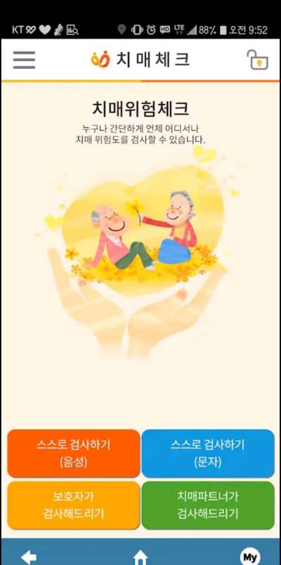 치매 검사 테스트 에서의 치매위험체크에는 다시 또 스스로 검사하기 음성과 문자, 보호자가 검사해 드리기, 치매파트너가 검사해 드리기 메뉴가 있습니다. 저는 스스로 검사하기 문자를 선택했는데 음성으로 지원되더라구요.