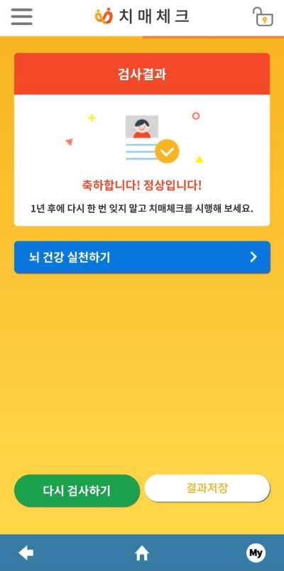 이 치매 검사 테스트 앱 실행 후 치매체크해 보셌습니다. 여러 메뉴가 있습니다. 우선 치매위험체크부터 한번 해 보고 그 후 뇌 건강 트레이너, 뇌 건강 실천하기 메뉴도 확인해 보아야겠습니다. 그리고 치매파트너와 치매지킴이라는 것은 무엇인지를 확인해서 다음 포스팅을 해 보겠습니다.