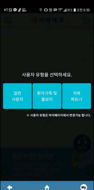 치매체크 앱을 다운 받습니다. 보건복지부, 중앙치매센터에서 운영하는 앱이니 걱정없이 쓸 수 있겠습니다. 앱 설치 후 사용자 유형은 일반사용자 / 환자 가족 및 돌보미 / 치매 파트너 세가지로 나뉘어져 있으므로 각자에 맞춰 터치해 주세요. 저는 일반 사용자로 이용해 보았습니다.