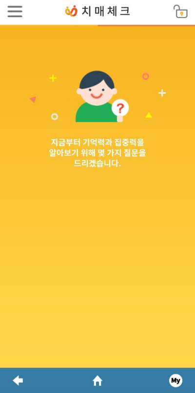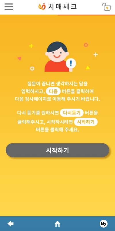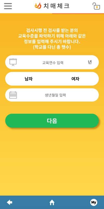치매 검사 테스트 앱 실행한 후 검사 시작하기 전에 먼저 학교를 다닌 총 횟수, 성별, 생년월일을 입력 후 질문에 네, 아니오를 선택하면 됩니다.