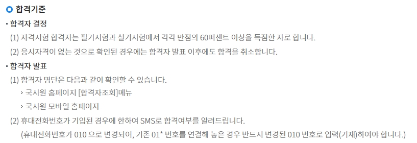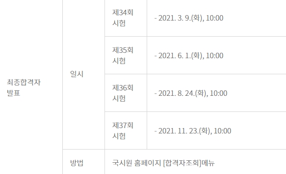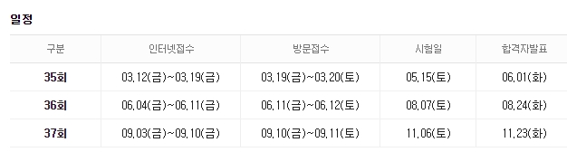 필기시험과 실기시험 각각 60% 이상을 득점해야 합니다. 합격자 발표 일정은 35회는 6월1일, 36회는 8월24일, 37회는 11월23일 오전 10시 입니다.