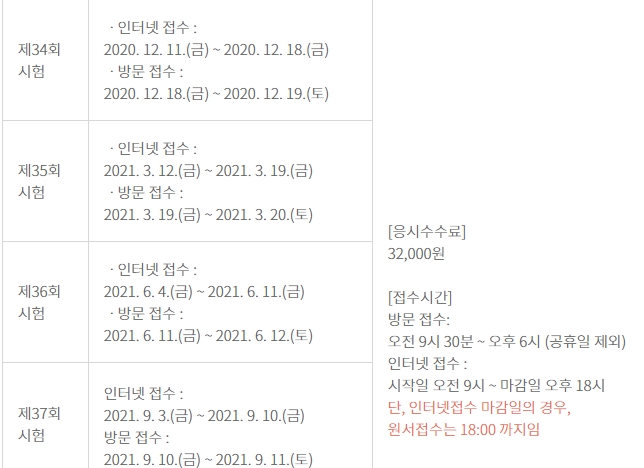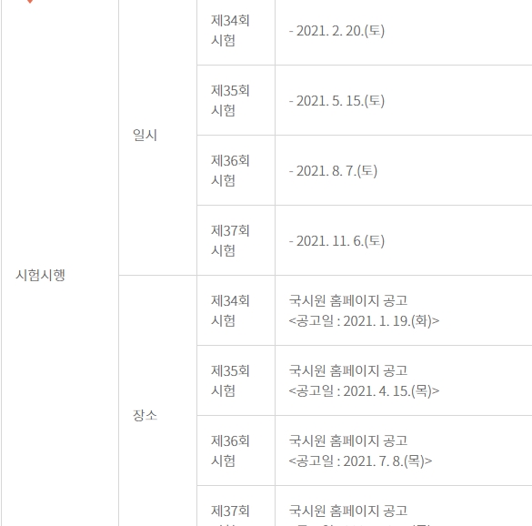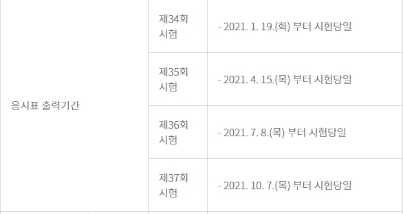 횟수로는 4번의 시험이 있습니다. 34회부터 37회까지이며 이 중 오늘 2021년 3월31일 기분으로 2월20일에 치루었던 34회 시험은 이미 지났습니다.