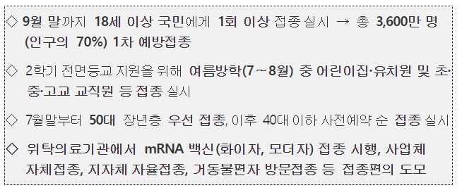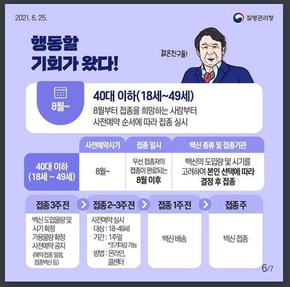 7월 백신 접종 대상자 물론 9월까지는 거의 모든 국민이 최소한 1차 이상의 접종을 완료할 수 있을 것으로 보입니다. 8월 부터의 접종관련해서는 접종 3주전에 사전예약이 공지됩니다. 예약과 접종 일정 그리고 접종 백신 등은 이때 알 수 있게 됩니다. 그리고 접종 2~3주 전 18~49세의 접종 대상자가 사전예약을 실시하고 백신접종 받게 됩니다.