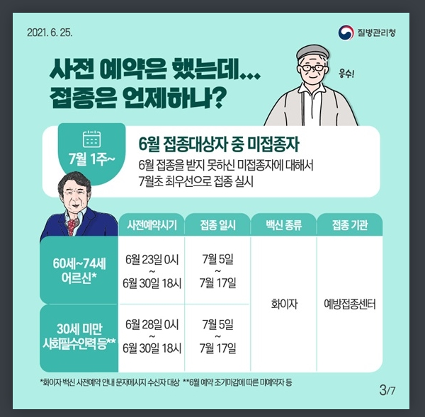 6월 예약자 중에서 코로나19 백신 접종 받지 않은 미접종자를 최우선으로 접종이 시작됩니다. 60~74세 어르신 중 6월 접종 대상자였지만 미접종인 경우 그리고 30세 미만 사회필수인력은 6월23일부터 6월30일 18시까지 사전예약을 합니다. 접종 일시는 7월5일부터 7월17일까지입니다.