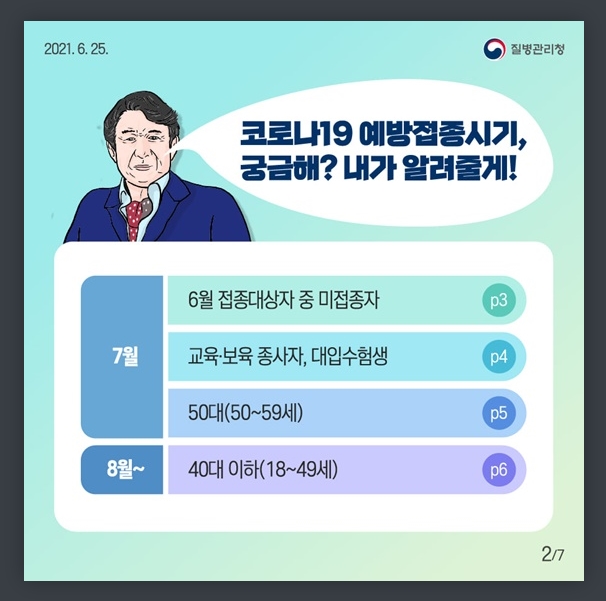 6월 접종대상자 중 미접종자, 교육과 보육 관련 종사자와 대입 수험생 그리고 50~59세 50대가 대상자가 됩니다. 그리고 8월부터는 18세에서 49세까지가 접종 대상자로 구분되어 있습니다.