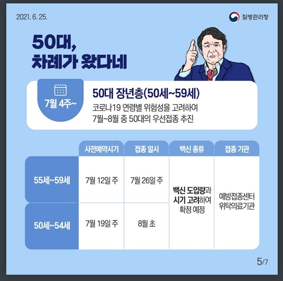 50대 장년층의 백신 접종이 시작됩니다. 50~59세의 우선접종이 추진됩니다. 좀 더 자세히 나누면 7월12일부터는 55~59세가 예약을 하고 7월26일, 50~54세의 경우는 7월19일에 예약하고 8월초 접종 대상자로 나뉘어져 있습니다. 그리고 어떤 백신을 접종받게 될 지 정확하지는 않습니다. 백신 도입량과 시기를 고려해서 확정될 예정입니다.