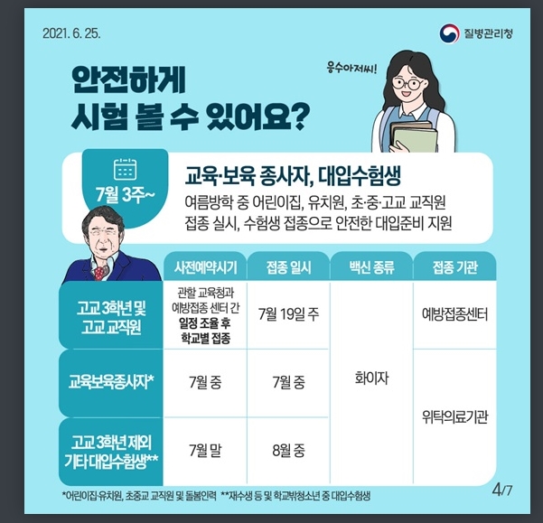 9월 2학기부터는 모든 학생이 전면 등교해서 수업을 받을 수 있도록 여름방학동안 교직원은 물론 대하수학능력시험을 준비하는 수험생들에게 백신 접종이 이루어지게 될 것입니다.